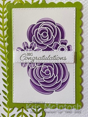 I used the floral mask from the Butterflies & Flowers Layering Decorative Masks and a Blending Brush to add Highland Heather ink to Basic White card. I used the more detailed floral mask and a Blending Brush to add Gorgeous Grape ink to the Highland Heather floral image. I die cut the image using one of the Stitched Rectangle Dies.