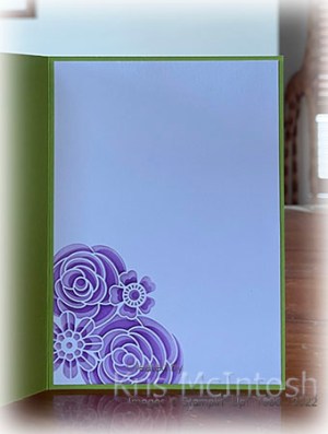 I attached the image panel to a Granny Apple Green scalloped rectangle cut using the Scalloped Contour Dies. The image panel is attached to the card front using dimensionals. I stamped the greeting from the Special Moments stamp set onto Basic White card using Smoky Slate ink and cut it out using a Stitched Rectangle Die. The greeting is attached to the card front using dimensionals. To decorate the inside of the card, I created the same floral image onto the lower left hand corner of Basic White card using Blending Brushes and Highland Heather and Gorgerous Grape ink.