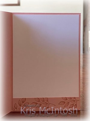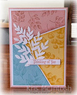 I used a piece each of So Saffron, Blushing Bride and Balmy Blue card. I stamped each panel with a different leaf image from the Forever Fern stamp set using the matching ink for each panel. I cut the panels into three using Monica’s instructions and then I sponged ink onto the outer edges of each panel using the matching ink. I attached three different panels to Basic White card for each card front.