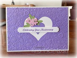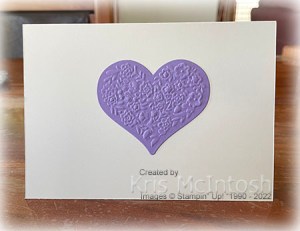 Today’s card uses the Love & Happiness bundle from the new Mini Catalogue. This bundle consists of a stamp set and a Hybrid Embossing Folder with co-ordinating dies. The stamp set has so many greetings for lots of occasions and the embossing folder and dies are amazing. For today’s card, I embossed Highland Heather card using the Bouquet of Love Hybrid Embossing Folder and the large heart from the Bouquet of Love Dies.