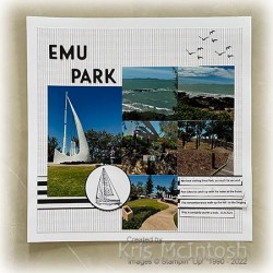 When we stay at Yeppoon we always visit Emu Park and catch up with Ron’s mate at the pub. It’s a pretty place with lots to see and the Rememberance walk up the hill to the Singing Ship is certainly worth seeing. For this page, I attached a piece of Pattern Party Designer Series Paper to the centre of a Basic White 12″ x 12″ page. I attached a strip of another design from the Pattern Party Designer Series Paper across the bottom of the page. I attached all of the photos flat to the page without adding an extra layer.