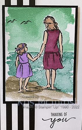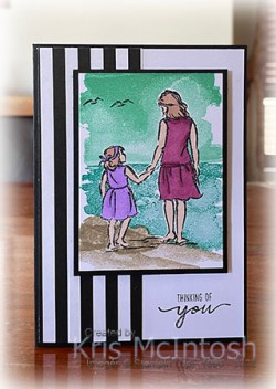 Today’s card is another one I created using the Oceanfront stamp set which I shared on my Facebook Live this week. I stamped “thinking of you” from the Beautiful Moments stamp set onto the lower right hand corner of Basic White card using Memento Tuxedo Black ink. I attached a piece of Pattern Party Designer Series Paper to the left hand side of the stamped Basic White card before attaching the panel to scored and folded Basic Black card. I stamped the image from the Beautiful Moments stamp set onto Basic White card using Memento Tuxedo Black ink.