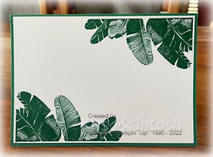 I attached the panel to scored and folded Shaded Spruce card. I cut Shaded Spruce card using one of the Ornate Layers Dies and attached it to the card front. I stamped the leaf image from the Island Vibes stamp set onto Basic White card using Shaded Spruce ink. I cut out the image using one of the Stitched Rectangle Dies.