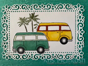 I coloured the image using Daffodil Delight and Dark Cajun Craze Stampin’ Blends. I cut a mask from a post-it-note and covered the stamped and coloured image. I inked the palm tree image from the Paradise Palms stamp set using Early Espresso and Mossy Meadow Stampin’ Write Markers. I stamped the image so that it would cover part of the stamped car.
