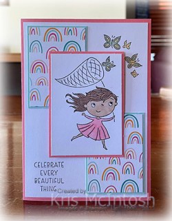 Today’s card uses the Catching Butterflies stamp set which is FREE with a qualifying order during Sale-A-Bration. For this card, I attached pieces of the Sunshine & Rainbows Designer Series Paper (also FREE during Sale-a-bration with a qualifying order) to Pool Party card. The panels are attached to Basic White card and then scored and folded Flirty Flamingo card. I stamped the butterfly image from the Catching Butterflies stamp set onto the upper right hand corner of the Basic White card using Memento Tuxedo Black ink.