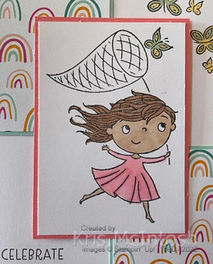 I also stamped the single butterfly image from the stamp set near the net using Memento Tuxedo Black ink. I coloured the girl image using Ivory, Bronze and Flirty Flamingo Stampin’ Blends. I coloured the butterfly using Dark Pool Party and Dark So Saffron Stampin’ Blends. I attached the image to Flirty Flamingo card and then the card front using dimensionals. To decorate the inside of the card, I attached a narrow strip of Sunshine & Rainbow Designer Series Paper across the bottom of Basic White card. I stamped the butterfly image from the Catching Butterflies stamp set onto the Basic White card using Memento Tuxedo Black ink. I coloured the butterflies using Dark Pool Party and Dark So Saffron Stampin’ Blends. I love this card, so happy, don’t you think.