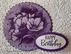 I used a White Watercolour Pencil to colour only the flowers on the image. I cut out the image using the largest circle from the Layering Circle Dies, attached it to a Gorgeous Grape scalloped circle cut using the same dies and then the card front. I stamped “happy birthday” from the Peaceful Moments stamp set onto Basic White card using Gorgeous Grape ink. I punched out the greeting using the Double Oval Punch.
