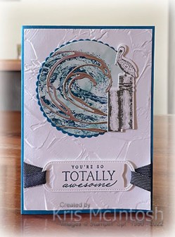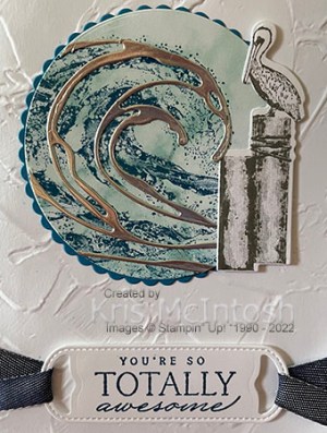 I embossed a piece of Basic White card using the Painted Texture 3D Embossing Folder and attached the image panel. I stamped the pelican image from the Waves of Inspiration stamp set onto Basic White card using Basic Gray ink and cut it out using the co-ordinating Wave Die.