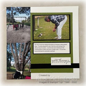 I attached narrow strips of Basic Black card across the bottom of each of the embossed panels. I attached two photos to Basic Black card and attached one to each of the Old Olive embossed panels. I created the title on the computer and printed it onto Very Vanilla card and fussy cut the words. I stamped the greeting from the Peaceful Moments stamp set onto Very Vanilla card using Old Olive card. I cut out the greeting using the heart from the Bouquet of Love Dies and attached it to the left hand page. I created my journaling on the computer and printed it onto Very Vanilla card before attaching it to Basic Black card. The jounaling is attached to the right hand page. I stamped the greeting from the Tasteful Touches stamp set onto Very Vanilla card using Old Olive ink. I cut out the greeting using one of the Stitched Rectangle Dies and attached it onto the right hand page.