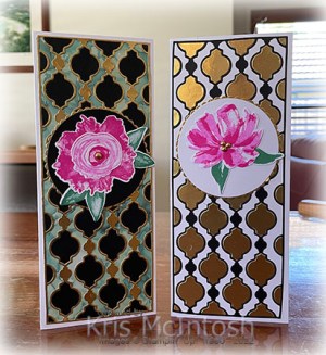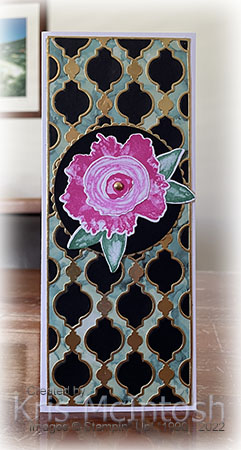 I attached the Basic Black circle to the Gold Foil scalloped circle and then the card front. I stamped the large flower from the Artistically Inked stamp set onto Basic White card using Magenta Madness ink. I stamped the medium flower from the Artistically inked stamp set onto Bssic White card using Magenta Madness ink which I stamped onto scrap paper first.