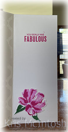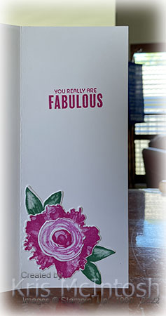 This time I stamped the large solid flower from the Art Gallery stamp set onto Bssic White card using Magenta Madness ink which I stamped onto scrap paper first. I stamped the detailed large flower over the top using Magenta Madness ink. I also stamped the leaf image from the Art Gallery stamp set onto Basic White card using Just Jade ink. I cut out the images using the co-ordinating Floral Gallery Dies. I trimmed away the stem from the leaves, layered them behind the flower before attaching to the Bssic White circle. I also added three Gold Brushed Metallic Dots to the centre of the flower. To decorate the inside of this card, I stamped, die cut and layered the flower and leaves as for the card front. The flower is attached to the lower left hand corner of the inside of the card. I also stamped the greeting from the Slim Sayings stamp set using Magenta Madness ink.