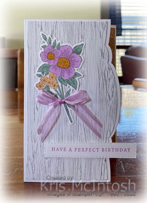 I cut out the image using the co-ordinating Flowers of Home Die. I attached the image to the front panel. I tied a bow in a length of Fresh Freesia Open Weave Ribbon and attached it to the flower stem using a Glue Dot. I stamped the greeting from the Blessings of Home stamp set onto Basic White card using Fresh Freesia ink and cut it out using one of the Stitched Rectangle Dies.I attached the greeting to the card front using dimensionals.