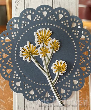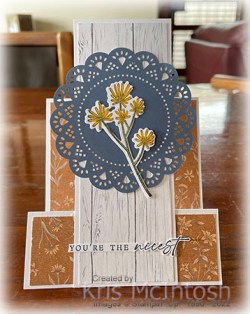 I cut out the flower using the co-ordinating Honeybee Blooms Die before attaching it to the centre of the Doily. I stamped the greeting from the Honeybee Home stamp set onto Basic White card using Misty Moonlight ink (retiring). I cut out the greeting using my paper snips and attached it across the bottom of the card. I also attached a piece of Heart & Home Designer Series Paper to the back of the card, which covers the join of the centre step panel.