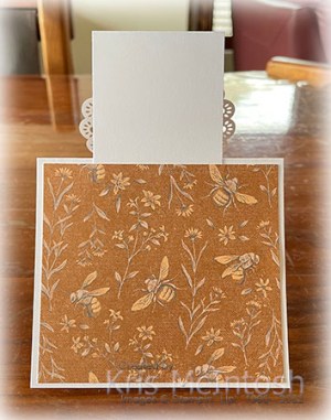 I attached a Misty Moonlight Heart & Home Doily (also retiring) to the centre step allowing it to overhang the edges. I stamped the image from the Honeybee Home stamp set onto Basic White card using Memento Tuxedo Black ink. I coloured the image using the Dark Daffodil Delight and Light Mossy Meadow Stampin’ Blends.