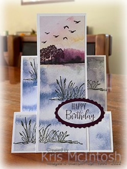 Today’s card is another Faux Centre Step card, these cards featured in my Facebook Live this week and thought I would share another one with you. I love the New Horizon Designer Series Paper and decided to use it on this card. I cut the card base and centre step from Basic White card. I cut all of the panels from New Horizon Designer Series Paper, matching the design as best as I could. I stamped the tree image from the On The Horizon stamp set onto the centre panel using Blackberry Bliss ink. I also stamped the birds from the On The Horizon stamp set using the same ink.