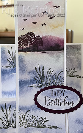 I stamped the grass image twice across the bottom of the centre panel using Mossy Meadow ink. I stamped the grass image onto the Designer Series Paper panels on the card base, matching them to the images on the centre panel as closely as I could.