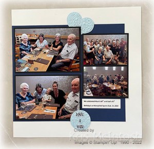 Today’s page shows off some photos from my Mum & Dad’s birthday lunch this year. My Mum turned 85 and Dad turned 91. For the left hand page I cut a circle from some retired “blue” 12″ x 12″ card that I had in my stash and attached it to a Very Vanilla 12″ x 12″ page. I attached Night of Navy card across the right hand side of this page and the left hand side of another Very Vanilla 12″ x 12″ page. I attached three larger photos to Basic Black card before layering them down the right hand side of the first page. I attached a strip of Crumb Cake card beside the left hand edge of the photos. I attached the two smaller photos to Basic Black card and attached them to the left hand side of the page. I added a strip of Night of Navy card below the two smaller photos and added “celebrate”. Celebrate was cut from Very Vanilla card using the retired Celebrate You Thinlets. I cut a circle from the same “blue” card using the Layering Circle Dies and embossed it using the Bouquet of Love Embossing Folder.