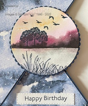 I stamped the tree image from the On The Horizon stamp set onto the Designer Series Paper circle using Night of Navy ink. I also stamped the birds and grass images from the same stamp set onto the Designer Series Paper circle also using Night of Navy ink.