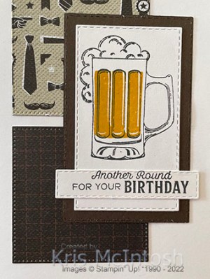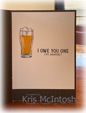 I stamped the greeting from the Brewed For You stamp set onto Basic White card using Memento Tuxedo Black ink and cut it out using one of the Stitched Rectangle Dies. I attached the greeting across the bottom of the stamped Basic White panel. To decorate the inside of the card, I attached a narrow strip of the He’s The Man Specialty Designer Series Paper across the bottom of Basic White card. I stamped the outline beer glass from the Brewed For You stamp set onto the panel using Memento Tuxedo Black ink. I added the fill image using Crushed Curry ink and the foam image using Memento Tuxedo Black ink. I stamped another greeting from the Brewed For You stamp set beside the beer glass using Memento Tuxedo Black ink.