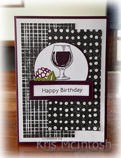 I stamped “happy birthday” from the Art Gallery stamp set onto Basic White card using Blackberry Bliss ink. I cut out the greeting using the Stitched Rectangle Dies. I attached the greeting to a Blackberry Bliss stitched rectangle and them the card front using dimensionals where necessary. To decorate the inside of the card, I attached a narrow strip of the Perfectly Penciled Designer Series Paper across the bottom of Basic White card. I stamped the wine glass outline using Memento Tuxedo Black ink and the wine glass fill image using Blackberry Bliss ink. I stamped a greeting from the Brewed For You stamp set using Blackberry Bliss ink.