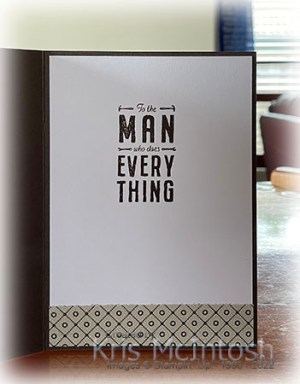I cut out the greeting using the rectangle die from the All That Dies. The image panel is attached to the card front using dimensionals. To decorate the inside of the card I attached a narrow strip of the He’s The Man Specialty Designer Series Paper across the bottom of Basic White card.