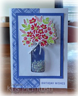 I attached one of the Vintage Bottle Shaker Domes behind the punched shape. I added some of the Effervescent Elements into the shaker dome and attached a piece of Window Sheet to close the shaker dome. I attached the Basic White rectangle to an Orchid Oasis rectangle cut using the Stitched Rectangle Dies then the card front.