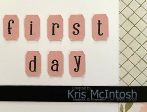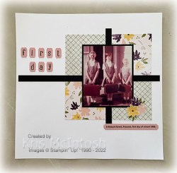 Today’s page shows off a photo I found of myself with my sisters on the first day of school 1966. Such a long time ago! I cut four squares from one of the papers from the Design a Daydream 12″ x 12″ Designer Series Paper. I attached the Designer Series Paper pieces to a Basic White 12″ x 12″ page so that the squares showed both sides of the paper. I attached narrow strips of Basic Black card over the joins in the Designer Series Paper.