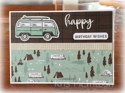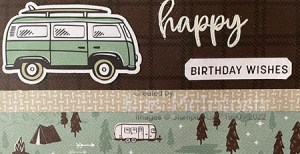 I attached the car image which is one of the die cut pieces from the He’s The Man Specialty Designer Series Paper to the top left hand corner of the panel. I stamped the “happy” from the Biggest Wish stamp set onto the card front using Versamark ink. I covered it with White Embossing powder from the Basics Embossing Powders and heat set it. I stamped “birthday wishes” from the Sending Smiles stamp set onto Basic White card using Early Espresso ink.