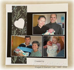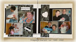 I attached the photos to Basic White card before attaching them to the pages. I printed “meeting Ethan” onto Basic White card and used the largest banner from the Stylish Shapes Dies to cut it out. I punched Basic White card using the scalloped heart from the Heart Punch Pack and attached one to each page. I punched Basic Black card and Basic White card using the smaller heart from the Heart Punch Pack and embossed each one using the Pretty Flowers Embossing Folder. I attached one to each of the scalloped hearts. I printed my journaling onto Basic White card and used the smaller banner from the Stylish Shapes Dies to cut it out. I attached the banner across the heart on the left hand page.