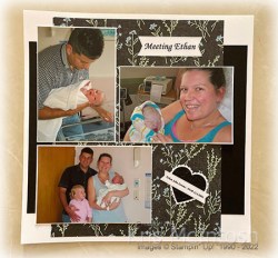 I attached the photos to Basic White card before attaching them to the pages. I printed “meeting Ethan” onto Basic White card and used the largest banner from the Stylish Shapes Dies to cut it out. I punched Basic White card using the scalloped heart from the Heart Punch Pack and attached one to each page. I punched Basic Black card and Basic White card using the smaller heart from the Heart Punch Pack and embossed each one using the Pretty Flowers Embossing Folder. I attached one to each of the scalloped hearts. I printed my journaling onto Basic White card and used the smaller banner from the Stylish Shapes Dies to cut it out. I attached the banner across the heart on the left hand page.