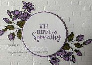 I cut a scalloped circle from Highland Heather card using the Layering Circle Dies and attached the greeting. The greeting panel is attached to the card front using dimensionals. I had coloured the floral images using the Light Highland Heather and Dark Old Olive Stampin’ Blends.