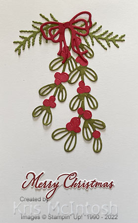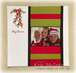 I cut two leaves from Old Olive card using the Mistletoe Dies and attached them to the top left hand side of the page. I cut the mistletoe image from Basic White card using the Mistletoe Die. I coloured the Basic White die cut using a dark Real Red and a dark Old Olive Stampin’ Blend before attaching it to the middle of the leaves. I die cut Real Red card using the bow die from the Mistletoe Dies and attached it to cover the ends of the leaves and mistletoe. I stamped “Merry Christmas” from the Mistletoe Magic stamp set onto Basic White card using Real Red ink. I used my paper snips to cut out the greeting before attaching it to the page below the mistletoe. I didn’t add any journaling to this page as the photo is pretty self-explanatory. Another simple page but one that looks really lovely, don’t you think?