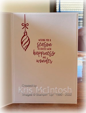 I stamped the greeting from the Decorated with Happiness stamp set onto Basic White card using Real Red ink and punched it out using the scalloped oval from the Double Oval Punch. The greeting is attached to the card front using dimensionals. To decorate the inside of the card I stamped the greeting from the Decorated with Happiness stamp set onto Basic White card using Real Red ink. I also stamped one of the bauble images from the same stamp set also using Real Red ink. I love the effect of these dies and of course you could rotate the panel and have the solid panel on the right instead of on the left of the card front. I can’t wait to try these dies with other stamp sets in my collection.