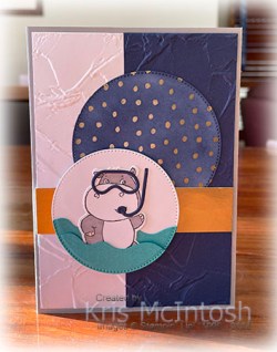 I made sure that only the outside edges were attached to each other. I stamped the hippo image from the Hippest Hippo stamp set onto Basic White card using Memento Tuxedo Black ink. I coloured the image using Light Smoky Slate and Dark Petal Pink Stampin’ Blends. I attached the hippo image to the circle making sure to slip it in between the waves. I cut Night of Navy card using the Hippo Dies to get the goggle image and also the breathing apparatus and attached the pieces to the hippo image. The image circle is attached to the card front using dimensionals. To decorate the inside of the card, I coloured a strip of the gold dotted Specialty Paper using Night of Navy ink and a Blending Brush. I attached the paper across the bottom of Basic White card and stamped the greeting from the Hippest Hippo stamp set using Memento Tuxedo Black ink.