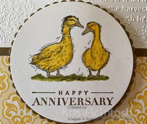 Today’s card is a little bit of fun, I decided to use the duck image from the Stylish Sketches stamp set (FREE during Sale-A-Bration with a qualifying order) to create an Anniversary card! I embossed Basic White card using the Timeworn Type 3D Embossing Folder and attached it to scored and folded Soft Suede card. I attached a piece of Designer A Daydream 12″ x 12″ Designer Series Paper across the bottom of the embossed card and attached a narrow strip of Soft Suede card across the top.