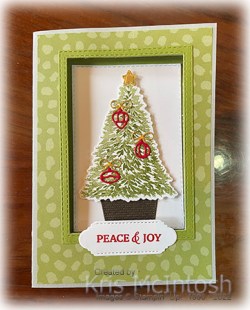To finish off the card, I stamped “peace & joy” from the Trimming The Tree stamp set onto Basic White card using Real Red ink. The greeting is cut out using one of the label dies from the Tree Trimming Dies and attached to the card front.