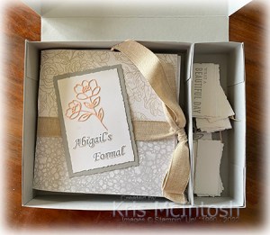 I promised Abigail that I would create an album for her to use as a keepsake for photos of her formal. I followed the instructions that Clare from Created the Ottaway shared here. I added cardboard to all of my pages and added an extra two envelopes to give Abi plenty of room for photos. Once I had assembled the envelopes, I used the gorgeous Abigail Rose 12″ x 12″ Designer Series Paper (gotta love the name) to decorate each of the pages. For the front and back covers, I did what Clare did and cut the paper into two pieces and covered the join using the Natural Finish Ribbon which will allow Abi to tie a bow to keep the album closed (I think it is going to end up kind of thick). I cut Basic White and Smoky Slate card using the Deckled Rectangle Dies and attached them to the Album cover. I die cut Petal Pink using the Cottage Flowers Dies to add to the Basic White panel. I printed the title onto Basic White card and cut it out using my Paper Snips.