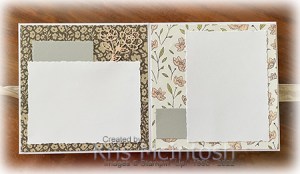 For the first pages, I added Designer Series Paper and Basic White Deckled Rectangles cut using the largest one that would fit on my 6″ x 6″ pages. I also cut Smoky Slate card using the second smallest Deckled Rectangle Die. A die cut petal pink flower using the Cottage Flowers Dies decorates the left page. On the right I stamped the single flower and single leaf images from the Cottage Rose stamp set onto Basic White card using Basic Gray ink. I coloured the flower using Petal Pink and Light Smoky Slate Stampin’ Blends and the leaf using Old Olive Stampin’ Blends. The images were cut out using the co-ordinating Cottage Flowers Dies.