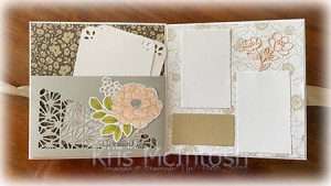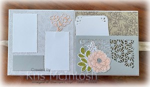 Once again the fourth page has the addition of Abigail Rose Designer Series Paper, Deckled Rectangles and two Basic White pieces in the pocket which is die cut using the Split Card Texture Dies. The flower on the left page is die cut from Petal Pink card and the flower on the right is stamped, coloured and die cut as before.