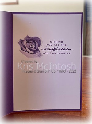 I cut the flowers and leaves from the Hues of Happiness Designer Series Paper using the Blossoming Happiness Dies. The flowers, leaves and the greeting are layered onto the Basic White circle. the banner and the Fresh Freesia flower are on dimensionals. I added three gorgeous grape dots from the Glossy Dots Assortment to the card front, just to add some bling. To decorate the inside of the card, I stamped another greeting from the Happiness Abounds stamp set onto Basic White card using Gorgeous Grape ink. I attached one of the flowers cut from the Hues of Happiness Designer Series Paper beside the greeting.