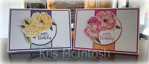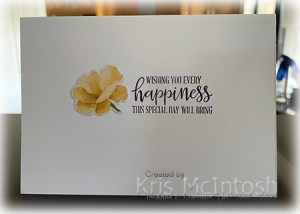 The panel is attached to a Gorgeous Grape scalloped circle cut using the largest scallop circle from the Layering Circle Dies. I cut three flowers from the Hues of Happiness Designer Series Paper using the Blossoming Happiness Dies. I also cut some leaves from the paper using the co-ordinating Blossoming Happiness Die. I layered the flowers and the leaves onto the stamped Basic White circle before attaching the panel to the card front using dimensionals. To decorate the inside of the card I stamped the greeting from the Peaceful Moments stamp set using Gorgeous Grape ink. I also attached another flower cut from the Hues of Happiness Designer Series Paper. I loved this card so much that I created another one using the same Designer Series Paper. However, this time, I used Melon Mambo ink and A4 card to create the card.