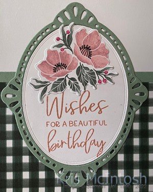 I used one of the frames from the Framed Florets Dies to cut Soft Succulent and Basic White card. I stamped the greeting from the Framed Florets Stamp Set onto the Basic White oval using Blushing Bride ink. The Soft Succulent frame and the stamped Basic White oval are attached to the card front. I die cut one of the pieces of paper from the Fitting Florets Designer Series Paper using the co-ordinating Framed Florets Die. I love how Stampin’ Up! has been co-ordinating at least one pattern from Designer Series Paper packs to be die cut with at least one of the co-ordinating dies. Fabulous! I attached the die cut flower to the stamped Basic White card.