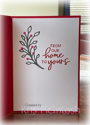 I trimmed the ends of the stamped panel and attached it to Real Red card which I also trimmed. The greeting is attached to the card front using dimensionals where necessary. To decorate the inside of the card, I stamped another greeting from the Framed & Festive stamp set onto Basic White card using Real Red ink. I attached a die cut, which I coloured to match the one on the front of the card, beside the greeting.