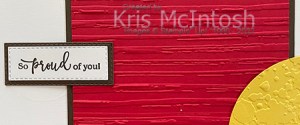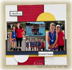 My two youngest granddaughters recently competed in grand finals for their netball club. One team won the grand final and the other team was runner’s up! Both girls played so well. I embossed a piece of Real Red card using the stripes folder from the Stripes and Splatters 3D Embossing Folders. and attached Early Espresso card down both sides before attaching the panel to a Basic White 12″ x12″ page. I embossed a piece of Night of Navy card using the stripes folder and a piece of Daffodil Delight card using the splatters from the Stripes and Splatters 3D Embossing Folders. I attached the panels across the lower part of the page, however, I did leave a spot without glue to slide the Basic White circle into.