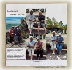 and Koorana Croc Farm. We had a lovely day visiting Emu Park where we did the Memorial WWI walk up the hill to the Singing Ship. It was a lovely sunny day but really windy (just check out the hair!). After our walk we had lunch at the Hotel. The next day we visited the Koorana Croc Farm. This is an amazing place and certainly worth a visit if you are in the Rockhampton area. I decided to create this page to co-ordinate with the one that I shared last week. I attached a piece of Boughs of Holly 12″ x 12″ Designer Series Paper across the bottom of the page before attaching my photos. I created the journaling on my computer and printed onto Basic White card. I stamped the palm tree image from the retired Island Vibes stamp set onto Basic White card using Old Olive ink and cut it out. I attached the palm tree image above the right hand photo. The title is printed onto Basic White card and fussy cut.