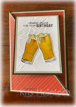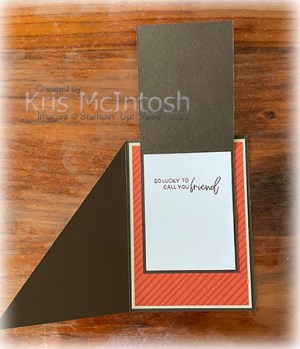 for your birthday. A really good friend of Ron & I celebrated his birthday recently and this is the card I made for him. I followed some instructions from Sherry Roth to create this fancy fold. You can find her card and instructions here. I cut the card bases from Early Espresso card. The large card base has the front panel cut on the diagonal. I added layers of Sahara Sand card to the inside of the large card base and on the diagonal panel. I layered He’s The Man 12″ x 12″ Designer Series Paper onto each of these panels, before attaching the smaller card base onto the large inside panel. I stamped the greeting from the Brewed For You stamp set onto Basic White card using Early Espresso ink.