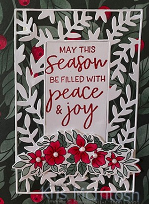 The central panel in the die comes as a separate piece and I stamped the greeting from the Framed & Festive stamp set onto the panel using Real Red ink. I attached the outer die cut to the designer series paper and then the central piece with the greeting. I stamped the floral bouquet from the Framed Florets stamp set onto Basic White card using Memento Tuxedo Black ink.