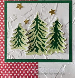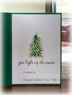 You can find the instructions to create the panel here. To decorate the inside of the card, I stamped the largest solid tree from the Trees For Sale stamp set using Soft Sea Foam ink. I stamped the detailed tree over the top using Shaded Spruce ink. I also stamped the greeting from the Trees For Sale stamp set below the tree using Shaded Spruce ink.