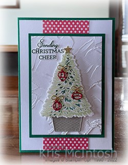 I attached the panel to scored and folded Shaded Spruce card. I created the panel as I did for the Decoration piece and you can find the instructions here, however, I did add a greeting. I stamped , the greeting from the Trimming The Tree stamp set onto Basic White card using Shaded Spruce ink and cut it out using my paper snips, before attaching it to the image panel.