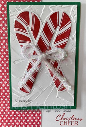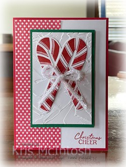 I attached a piece of Sweetest Christmas 12″ x 12″ Designer Series Paper down the left hand side of Basic Whtie card. I stamped the greeting from the Sweet Candy Cane stamp set onto the lower right hand corner using Real Red ink. I attached the image panel to scored and folded Real Red card using dimensionals. I tied a bow in a length of 3/16″ Iridescent Trim and attached over the candy canes usng a Glue Dot .